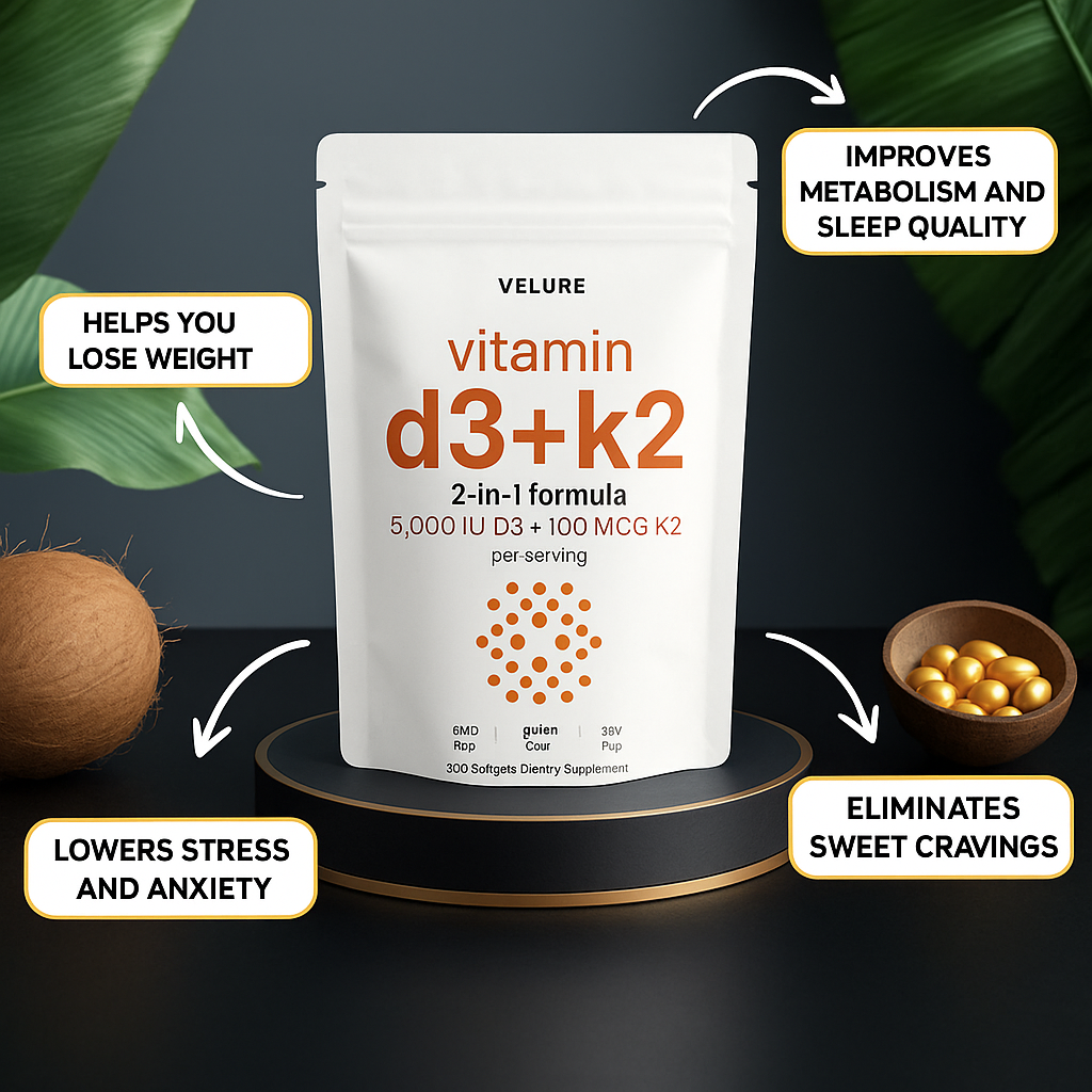 Velure's Vitamin D3 and K2 supplement is designed to support optimal calcium management in the body. Vitamin D3 enhances calcium absorption from the gut, while Vitamin K2 directs calcium to the bones where it is needed most, preventing calcification in the arteries and other soft tissues. This synergistic action ensures that calcium is utilized effectively, promoting overall skeletal health and reducing the risk of conditions related to improper calcium distribution.